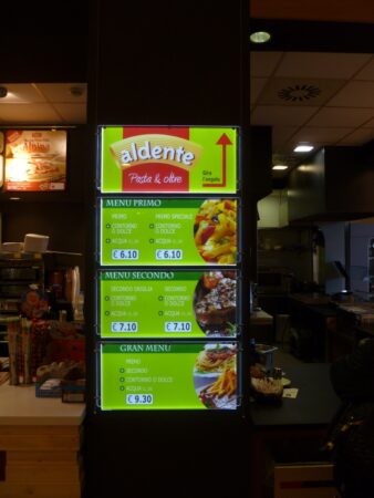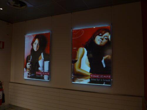 Mantenendo costante l’interasse cavetti, possono essere alloggiate le diverse combinazioni di formati, con tasche piatte o porta depliants, il tutto fissato a parete con attacchi, morsetti e cavetti in acciaio.